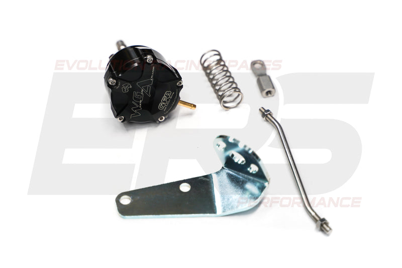 WGA part # 7302 is designed to bolt on to EVO 9 models with the factory turbo. The 10psi and 7psi springs are installed for a base pressure of 17psi, with the 5psi spring included in the packaging for further tuning options.